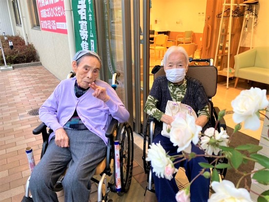 デイサービスの入り口に植えている『白いつるバラ』がきれいに咲き