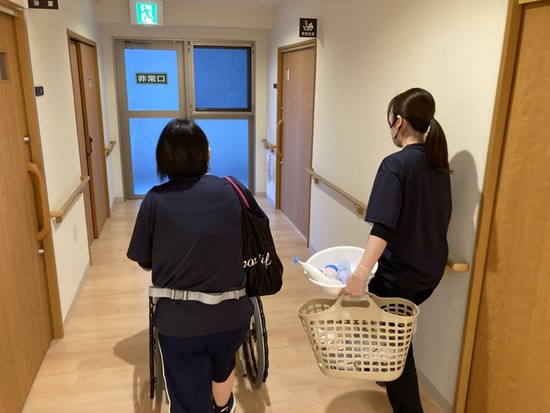 今日は特別機械浴をご利用される入居者様の入浴へ