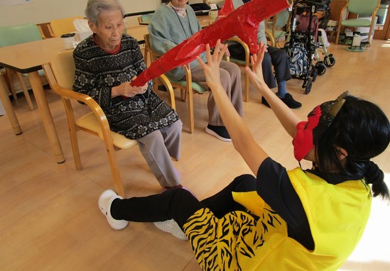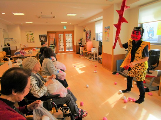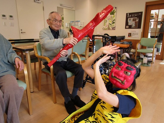 2025年02月05日(水) 鬼は外~デイサービス~ 「トリャーーーーーーーーーッ」 と現れた、毎年恒例の節分の鬼!!!! 皆さん、体を乗り出して鬼退治です!! 皆さんの本気に鬼もたじたじ(;'∀') あっという間に退治されてしまいました(⋈◍>◡<◍)。✧♡