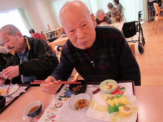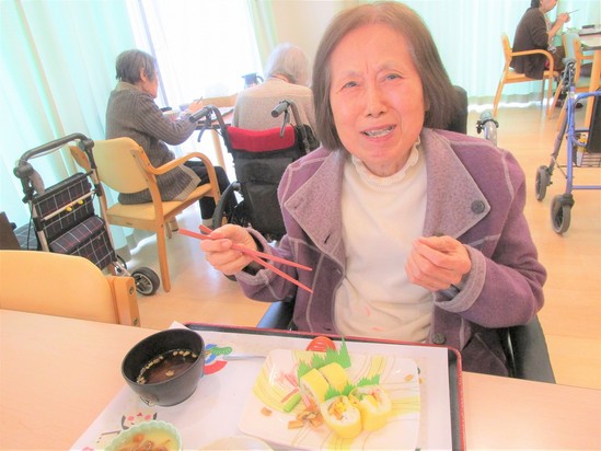 2025年02月12日(水) 巻きずしランチ♪ 節分に欠かせない巻きずし(^^♪ アルファリビングでは卵巻きが出ました☆ 穴子も入って豪華(⋈◍>◡<◍)。✧♡ 「おいしいよ♪」と良い笑顔!! いつも美味しいご飯を作ってくださる厨房の方に感謝です☆