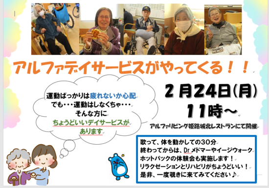 2025年02月18日(火) デイサービス体験会実施します(^_-)-☆ 10月に実施して大好評だったデイサービス体験会!! 今年もやります♪ 入居者様だけでなく、ご家族、お友達・・・地域の方などなど どなたでも 大歓迎です(⋈◍>◡<◍)。✧♡