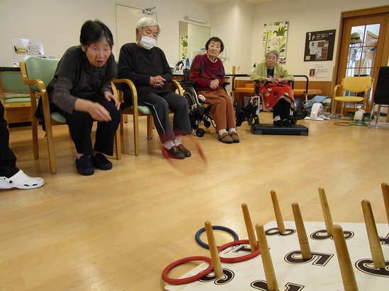 2025年03月17日(月) ひな祭り輪投げ大会~デイサービス~ お雛祭り、輪投げ大会を開催しました!! 間近で見ていただきたいくらいの白熱した試合!! 真剣そのものです(@ ̄□ ̄@;)!! 「もっと右!!」 「いやーーーーっ!!外れた!!」 など、いつもになく大きな声が飛び交います!! さあ・・・・優勝は誰の手に!?