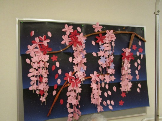 2025年04月07日(月) 4月の壁面~デイサービス~ 枝垂桜の花が綺麗に咲きました(^^♪ 一枚、一枚丁寧にご利用者様が切ってくださり 貼り合わせていただきました(*'ω'*) 素敵な出来上がりににっこり(⋈◍>◡<◍)。✧♡