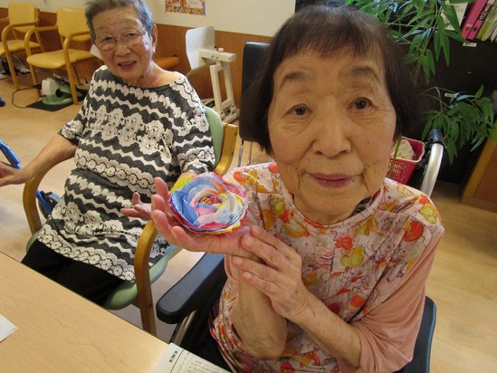2025年07月14日(月) 素敵なバラの花~デイサービス~ アルファデイサービスの7月は・・・・ 素敵な薔薇の製作です(⋈◍>◡<◍)。✧♡ キッチンペーパーを絵具に浸して・・・ 真剣な表情で色合わせをされるS様(^^♪ 「素敵でしょ♪♪」 とハイカラな色使い!! 個性の出る 出来上がりが楽しみですね☆