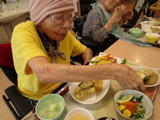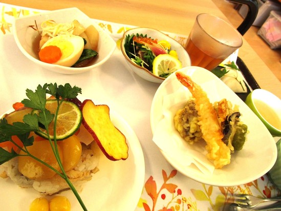 2025年10月20日(月) 秋の味覚御膳~デイサービス~ お花の紙をめくると・・・・・ そこには・・・ 秋の味覚御膳!!!!! 何から食べようか・・・ソワソワ( *´艸`) 栗も、きのこも、ぎんなんも・・・・・・ カツオも角煮も天ぷらも・・・・ 美味しくいただきました(⋈◍>◡<◍)。✧♡