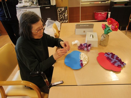 2026年02月06日(金) 共同作業~デイサービス~ 「これは簡単、簡単♪」と言われスイスイ作ってくださるS様★☆ 慣れた手つきで貼ってくださるY様・・・ 皆様の共同作業で、素敵な作品が出来上がっています!!