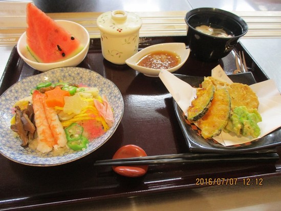 2016年07月08日(金) 笹の葉さ~らさら♬ スタッフが笹を調達し、御入居者様が飾りを作り、短冊に願いを込めて飾りました そして、厨房さんからは、七夕ランチ 食材が星の形になっていて、豪華で可愛いですね。 皆様の願いが天の川に届きますように☆彡