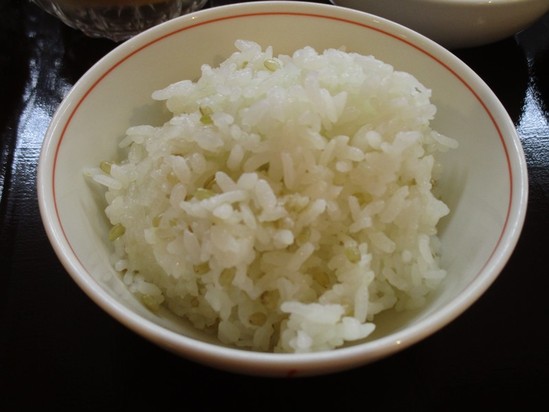 2017年02月28日(火) 2月の健康米『緑米』 赤米や黒米と同様に縄文時代に中国から伝わったとされる。玄米の色が緑色を帯び、秋には紫がかった稲穂をつける。全国でも生産量が少ない貴重種のもち米で、亜鉛やマグネシウム、繊維を豊富に含み、血液浄化や精神安定などにも効果があるといわれている。 その緑米を使ったご飯が ご飯をアップにして見ましたが、見にくい。。。 緑米の食感は玄米みたいにプチプチしているそうです 。 自宅では、中々食べることが少ないので、カフェで提供してもらえると 嬉しいですね