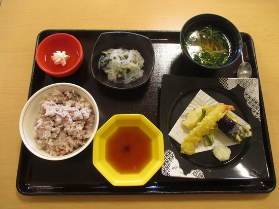 2017年09月27日(水) 今月の健康米メニュー☆ 9月は三穀米を使ったメニューです\(^o^)/ そのほか 天ぷら盛り合わせ 春雨の酢の物 すまし汁 アップルゼリー 美味しくいただきました!(^^)!
