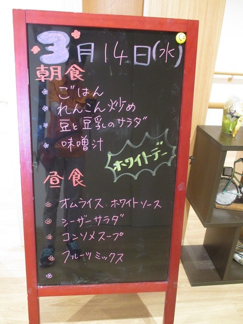 2018年03月17日(土) ホワイトデー❤ 3月14日は ホワイトデー ホワイトにちなんで、白を基調にしたメニューでした。 ホワイトソースのオムライス(中はケチャップライス)は『美味しかった』となかなか好評でしたv^^v男性を代表して、愛を込めて(?)お花を捧げます。