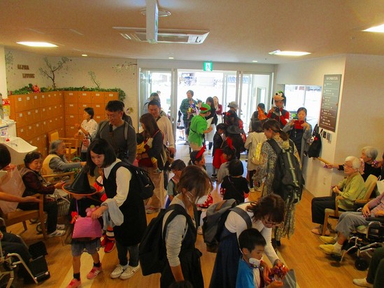 子供たちはお菓子を貰えて、ご入居者様は子供たちと触れ合えて