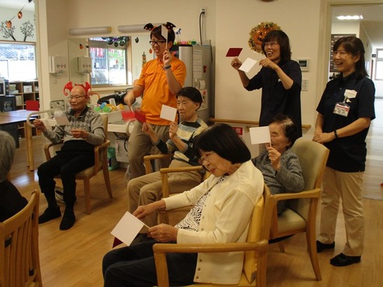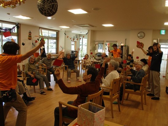ディルームをお借りしてラジオ体操、歌体操、旗揚げゲームをしました。