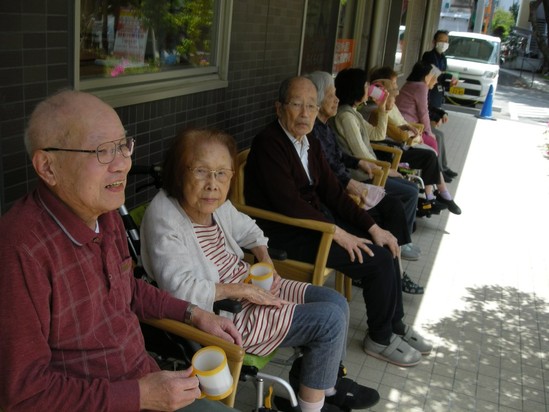 2019年05月04日(土) アルファデイカフェ??? 本日は天気が良く、気持ちが良いです‼ と言う事で急遽カフェの気分を味わおうとお外でお茶をしました。 皆様、お話も弾んで楽しそう・・・ ツツジの花も満開でみつばちが蜜を吸っています。 それを「かわいいね」と利用者様がながめられていました‼