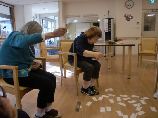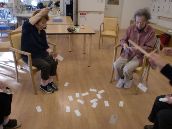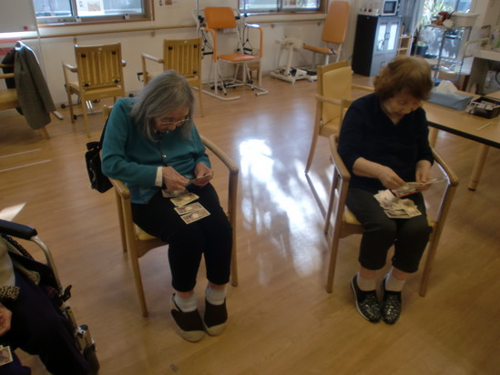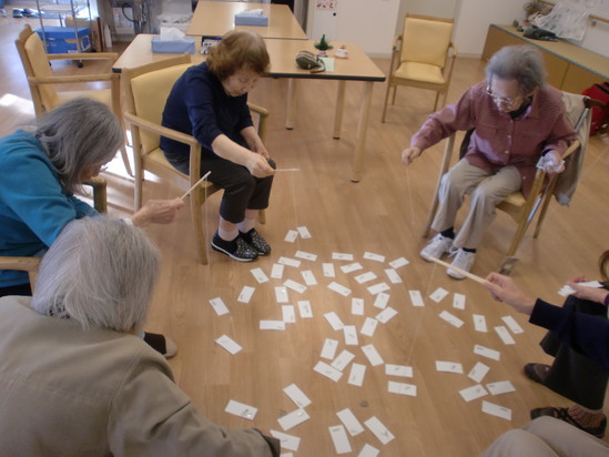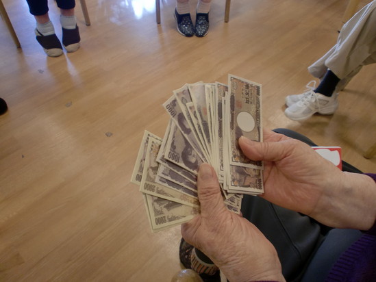 裏返したお札(おもちゃ)を釣り竿で釣っていきます。
