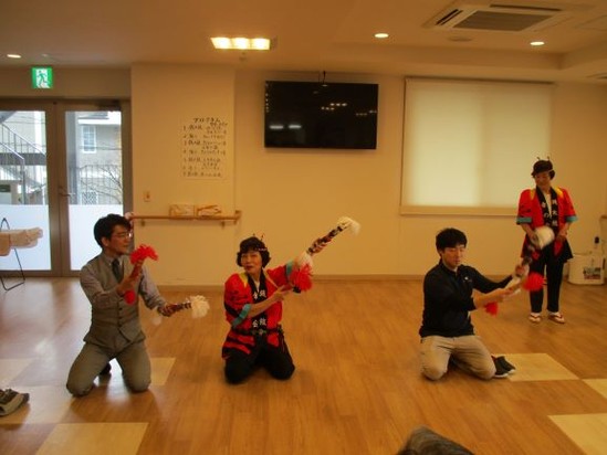 銭太鼓の体験を施設長やスタッフも体験されました。
