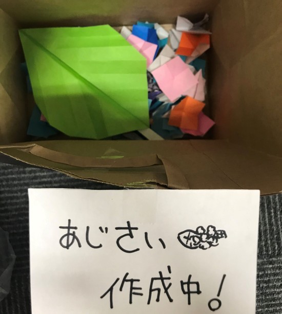 2020年05月05日(火) 少し早めの... 五月に入り、気候が変わりつつあり暑い日々が続いています。 そんな中、利用者様とスタッフで少し先の季節の飾り付けの準備をしています。 折り紙でとても器用に上手に作って下さっています アジサイの完成がとても楽しみです