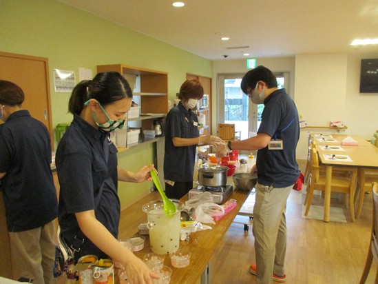 今回は久しぶりのイベントでありコロナウィルス対策もしっかり行い開催しました。利用者様は「冷たくて美味しいわ」など仰られイベントを行って良かったと思いました。