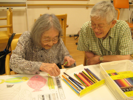 2020年07月18日(土) カラフルな魚たち 今日は何やら楽しそうに相談されているお姿が見られました。 そぉーとのぞいてみると、、、 色々な魚たちに「何色塗ろうか?」とお二人で色を決めておられました(^^♪ 完成後はまた飾り付けをさせてもらいます‼ 楽しみです♪(^O^)
