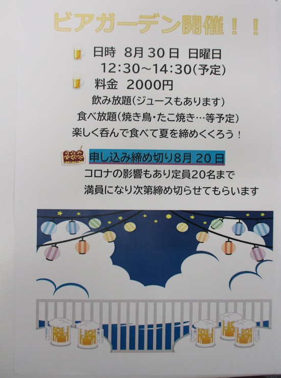 2020年08月06日(木) ビアガーデン開催予定 8月30日(日)にビアガーデンを開催予定です。 今年は新型コロナウイルス感染拡大を受け夏祭りが中止となった為、人数制限を設けてビアガーデンを開催します。 皆さんのご参加をお待ちしております