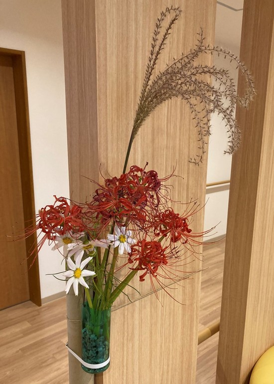 先日からレストランのエレベーター前に利用者様が季節の花を飾って下さいました。今回はススキと彼岸花がメインです。