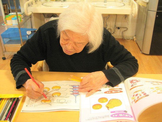 M様はいつも熱心に塗り絵をされており、細かい所もとても丁寧に、色使いも工夫されています。