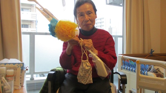 ラッピングに花飾りをつけて、『リップスティック』は花柄の巾着袋に入れました。誕生日当日、訪問してプレゼントをお渡しすると「ひゃ~、どうもありがとう、とっても嬉しいわ」と喜んでいただきました。