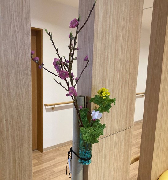 こんにちは! 3月になりレストランエレベーター前に桃の花と菜の花を利用者A様が飾って下さいました。