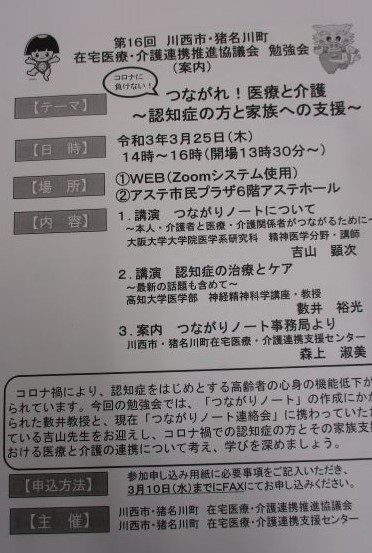 3月25日に川西市、猪名川町在宅医療、介護連携推進協議会・介護連携支援センター主催の勉強会が開催されました。
