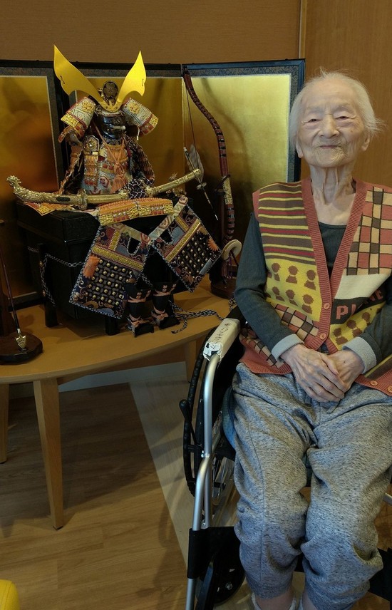 ある日のこと、端午の節句の準備をしていたらお散歩から帰って来られた入居者様に「良かった、兜と一緒に写真を撮りませんか」とお声掛けをしました