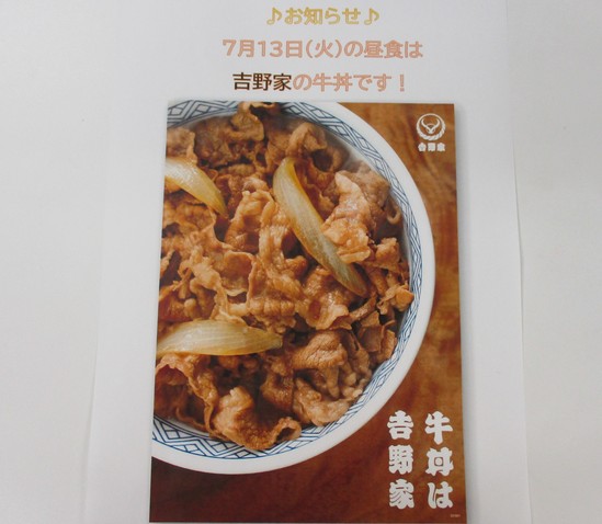 7月13日(火)の昼食で日頃からお食事の提供をしていただいてる魚国総本社さんとあの牛丼の吉野家さんのコラボレーションで特別メニューを提供してくださいます