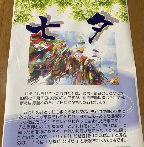 2021年07月16日(金) 七夕 こんにちは!先日は七夕でしたね。生憎の雨でしたが皆さんは願い事はしましたか? 昼食では七夕そうめんが提供され皆さん嬉しそうに召し上がられていました。 まだまだ暑い日が続きますが暑さに負けずに夏を乗り切りましょう。