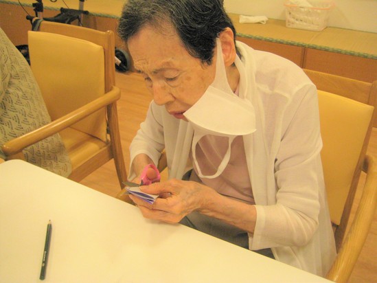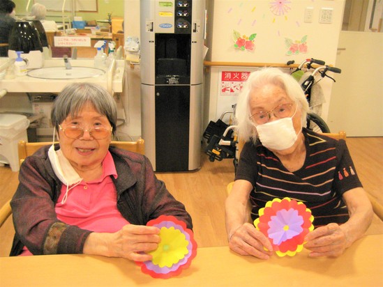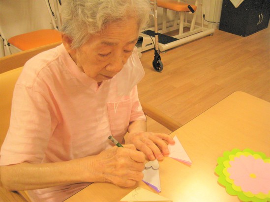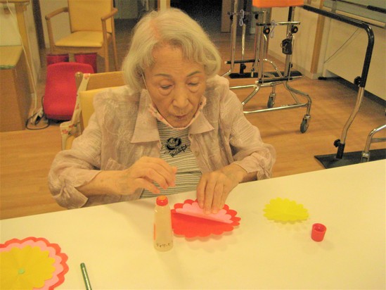 2021年09月04日(土) 9月の壁作品(制作) 8月より9月分の作品制作に取り組んで頂きました。 何色がいいかな~♪ 三角に折るの⁉ 上手く切れないわ、、、 などなど、おしゃべりをしながら取り組んでおられました。 じゃーん、9月の作品、菊の花出来上がり‼(^O^)