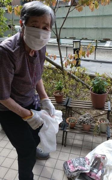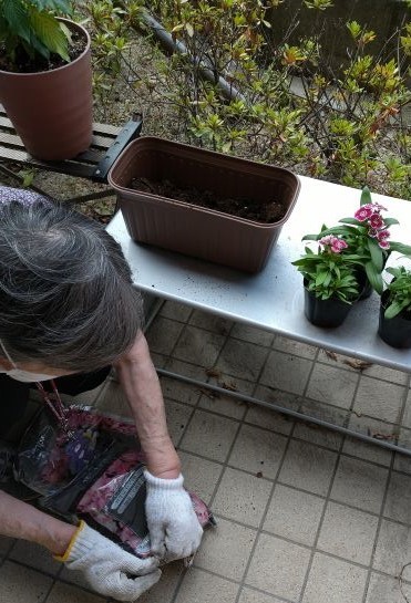 こんにちは、先日スタッフと利用者のY様が花壇の手入れをされていました。