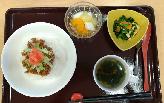 タコライス風・菜の花のお浸し・わかめと人参のスープ・フルーツ杏仁