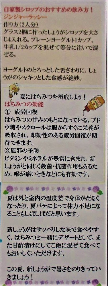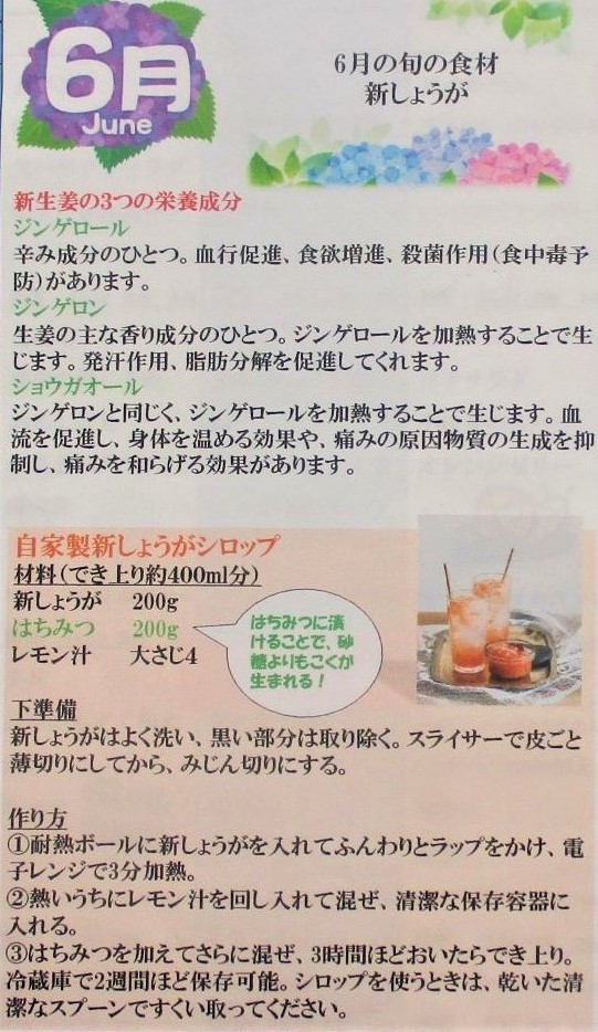 2022年06月15日(水) ☆ 6月 厨房便り ☆ 今月の食材は、新しょうが厨房さんがしょうがシロップとジンジャーラッシーの作り方を教えてくれました。 6月14日 に近畿地方に梅雨入りが発表されました‼ 14日夕方は梅雨寒で、寒い思いをして 帰宅された方々が多かったのではないでしょうか? 是非、しょうがシロップなどを活用して、 身体を温めて、体調を崩さないよう心がけてください