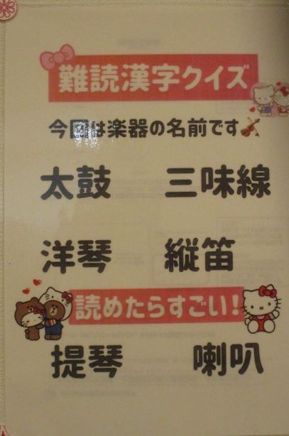 2023年02月12日(日) 読めますか? 寒い日が続きますが体調を崩してはいませんか?寒いとついつい身体を動かすのがおっくうになりがちです。身体も、脳も働かせましょう! 今回の難読漢字は楽器です。 答え ↓ 太鼓→たいこ 三味線→しゃみせん 洋琴→ピアノ 縦笛→リコーダー 提琴→バイオリン 喇叭→ラッパ 全部読めましたか???