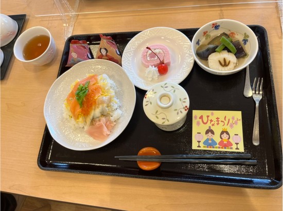 昼食は特別な献立で『生ちらし寿司』『蛤しんじょうの炊き合わせ』『茶わん蒸し 』『桜ロールケーキ』でした
