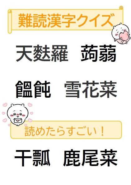 2023年04月04日(火) 難読漢字クイズ 桜の花も咲きほこり春も一段と深まってきました。 「春眠暁を覚えず」ともいいます。ウトウトばかりもしていられません。 脳を働かせ難読漢字にチャレンジしてみてください。今回は食べ物です。 答え 天麩羅→てんぷら 蒟蒻→こんにゃく 饂飩→うどん 雪花菜→おから 干瓢→かんぴょう 鹿尾菜→ひじき 全部読むことが出来ましたか? 利用者様は雪花菜と鹿尾菜に四苦八苦されているようでした