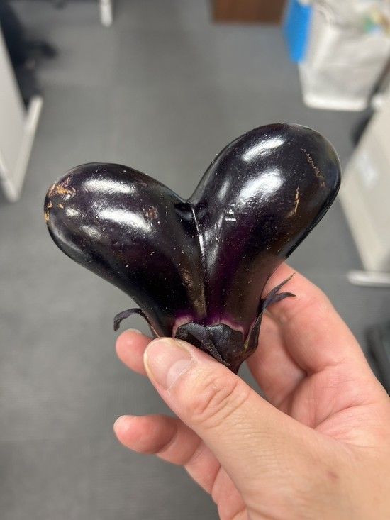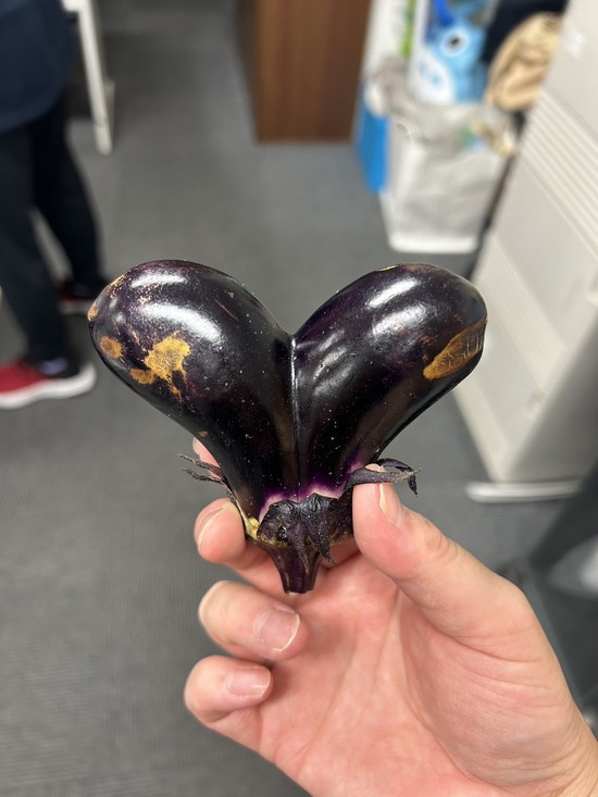 2023年09月27日(水) 何の形かな?(^^) 実りが多い秋になりスタッフの菜園も色んなお野菜が収穫されて、私たちにも分けくださいます 嬉しい限りです、ありがとうございます そんな中こんな珍しい形の二股のおナスが採れたそうです 私はハートの形に見えますが皆様は何の形に見えますか⁉