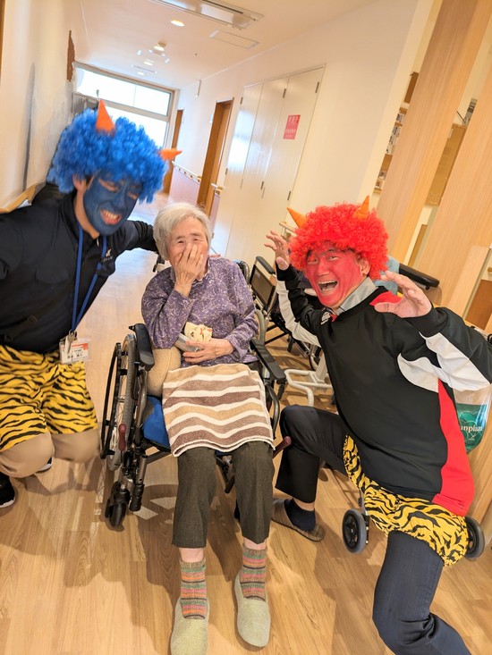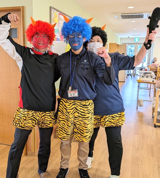 3人の鬼さんが福豆を配りにやってきました