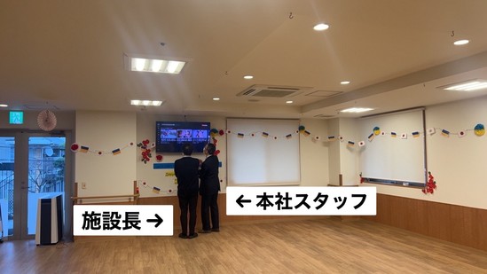 本社のスタッフと施設長がテレビモニターの確認を行っていました。