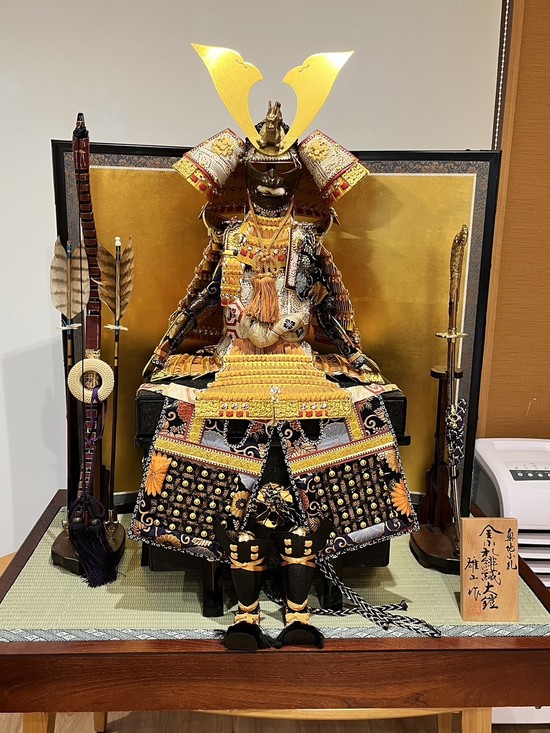 ラウンジには兜を。玄関から入って正面に見えるように配置。