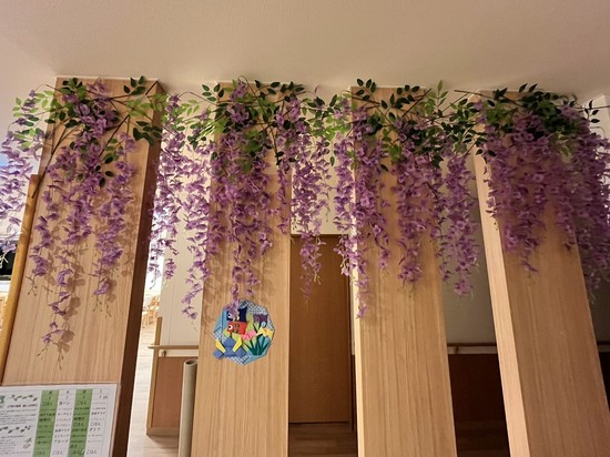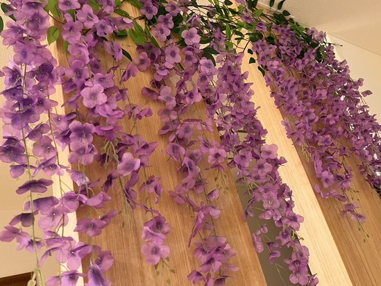 レストランの壁面には藤棚を。 エレベーターでレストランがある2階に到着すると、紫色のカーテンがお出迎え♥♥♥