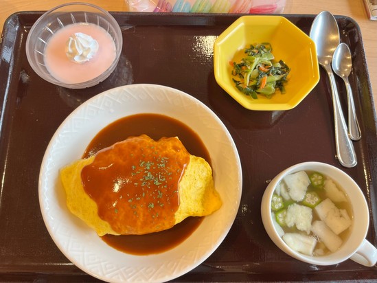 この日のお昼のメニューはオムライスとイチゴのババロア♥ でピンクをイメージ(?)