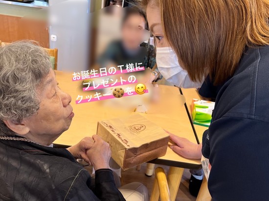 2024年05月24日(金) 誕生日おめでとうございます!(5月編)。 5月生まれの皆様 誕生日おめでとうございます! 18日に誕生日を迎えられたI様は、家族様からお祝いの花が届いていました 一方、21日に誕生日を迎えられたT様。 スタッフよりクッキーをプレゼントしたところを撮影。 来年もまた一緒にお祝いしましょう♥