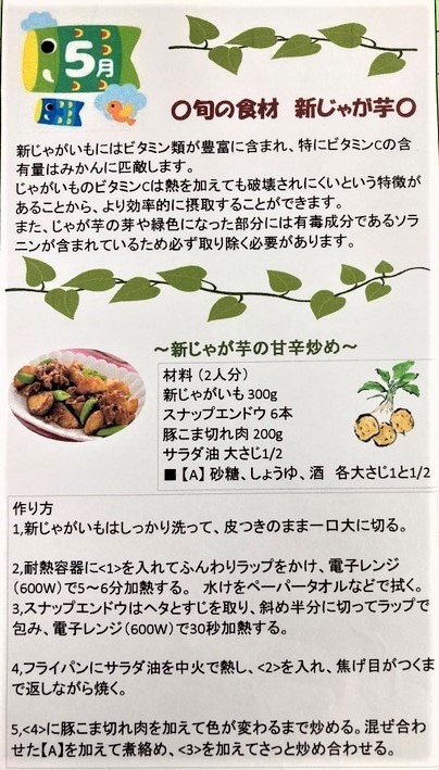2024年05月30日(木) ☆ 5月 厨房便り ☆ 今月の食材は、新じゃが芋です春先から夏にかけて旬を迎える新じゃがは、美肌や免疫力アップ などの効果が期待できる優れた美容食材!! ビタミンCの含有量はイモ類の中で最も多く、 カリウムも豊富に含まれています。 【ビタミンC】 免疫力を高め、コラーゲンの生成を促す。 【カリウム】 塩分(ナトリウム)の排出を促し、血圧を下げる。 また食物繊維が豊富なので、腸内環境を整えてくれます。 是非、食事に取り入れてみて下さい!!