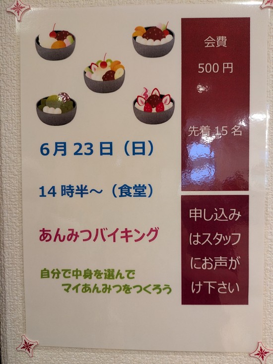 2024年06月20日(木) あんみつバイキング(予告)(^^) 来たる6/23(日)に あんみつバイキングを行うことになりました 当日の模様は後日、お伝えします 参加される方は今からワクワクしてるそうです