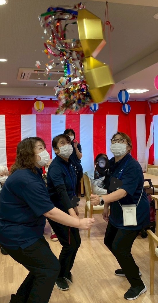 お祝いのくす玉を開設から勤続してるスタッフ一同で開きました