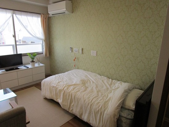 (岡山野田モデルルーム・照明、エアコン、カーテンは標準設置。テレビ、 タンス、ローテーブル、チェアーはあなぶきヘルスケア取り扱い商品です)