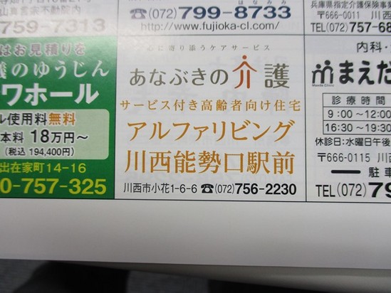 2016年02月21日(日) 川西市老連だよりに協賛広告を出しました 川西市老人クラブ連合会が発行している老連だよりに協賛広告を出させて 頂きました。色々な方にあなぶきの介護を知ってもらうことはもちろんですが 私たちも地域活動や地域事業なども勉強して、少しでも地域の一員に なれるようにと思っています。